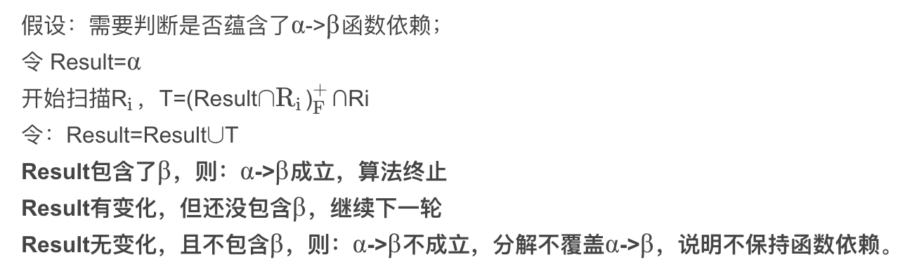 - 消除掉冗余依赖后,看函数每个依赖的左右两边属性是否都在同一个分解的模式中